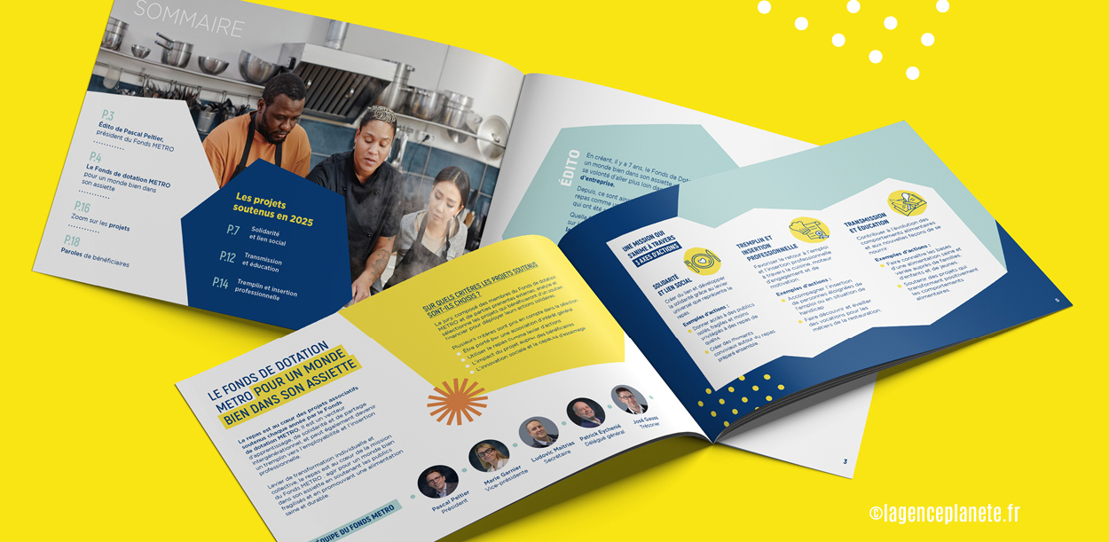 Depuis son lancement en 2019, le Fonds de dotation METRO publie chaque année un rapport annuel à destination de ses parties prenantes, qui met en lumière les initiatives solidaires et projets d’associations d’intérêt général soutenus. Ce document valorise également l’engagement des collaborateurs porteurs de projets et rappelle la raison d’être du Fonds METRO : œuvrer pour « un monde bien dans son assiette ».